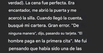 Mi pareja insistió en pagar la cuenta; me arrepiento de haberle permitido hacerlo.