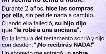 Cuidé de mi vecina solitaria durante 2 años. Al leer su testamento, su hijo dijo que no recibiría NADA… Entonces el abogado me entregó esto.